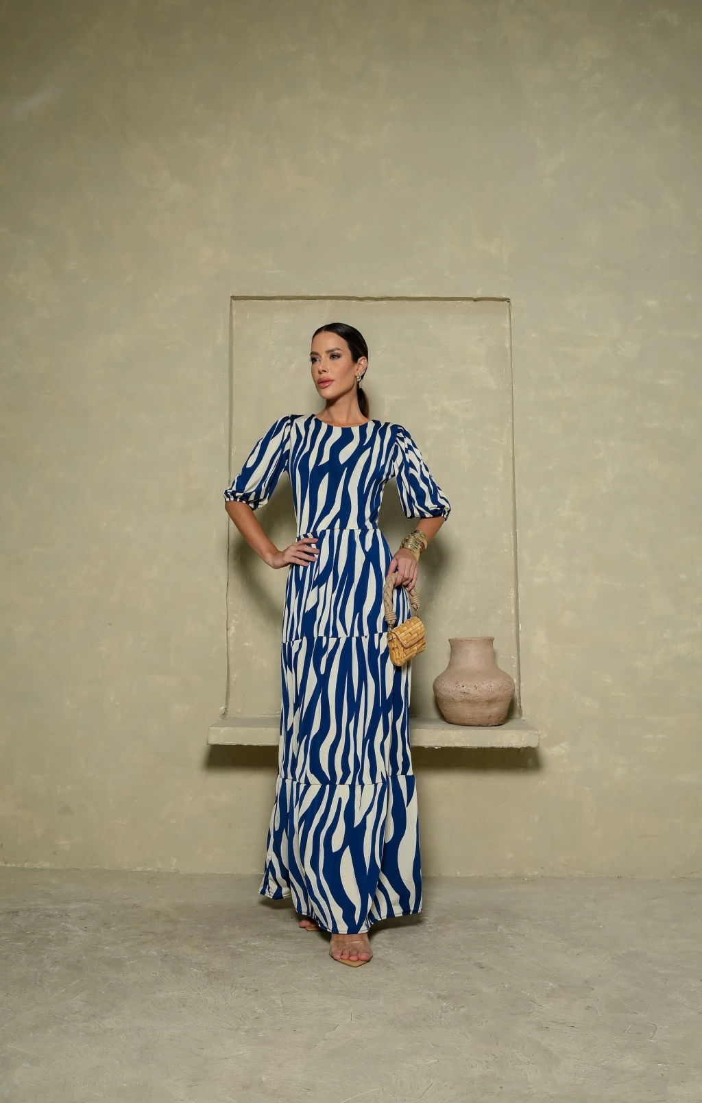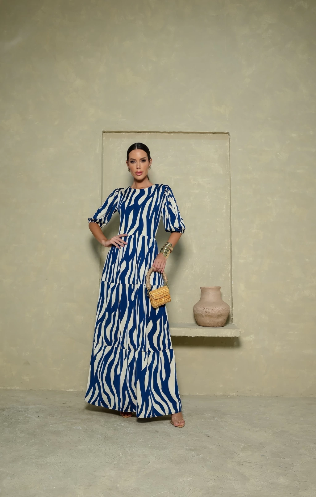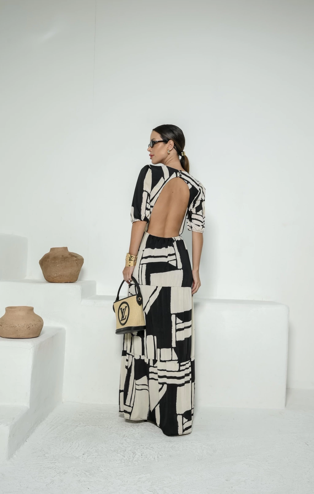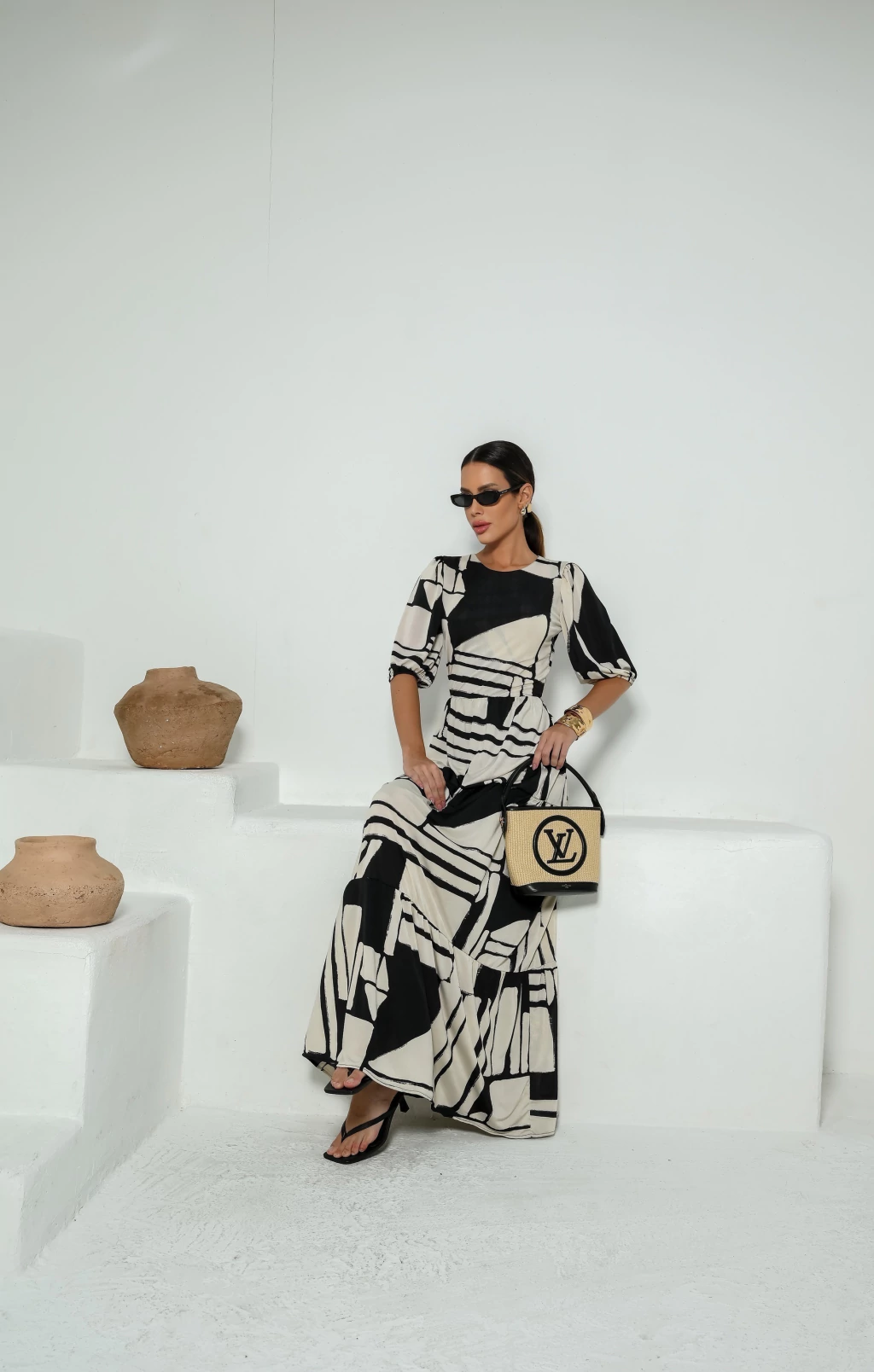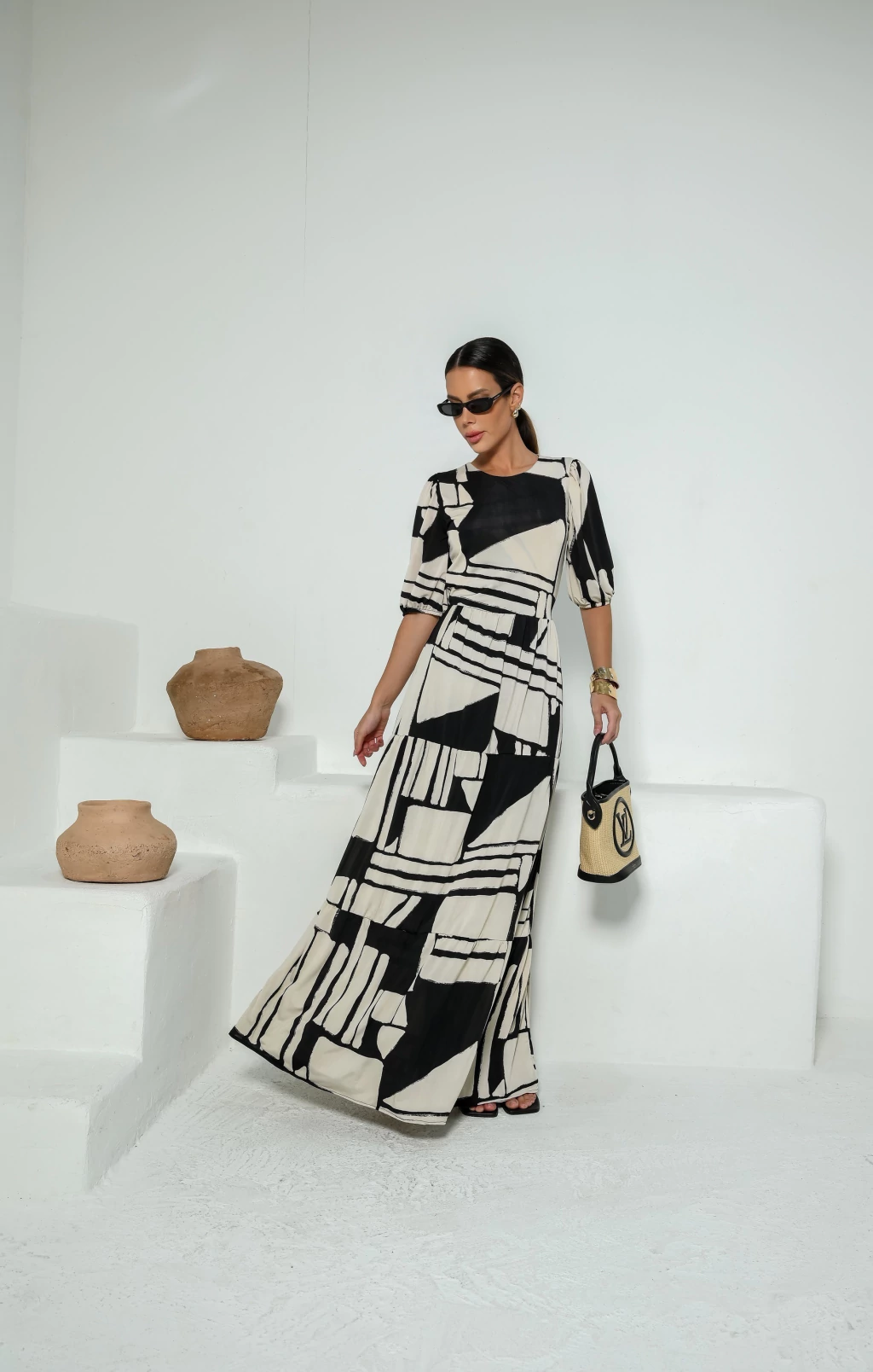 Vestido longo Love 2, confeccionado em tecido Fluity, leve, macio e com excelente caimento. Possui estampa geométrica moderna em tons contrastantes, decote profundo nas costas, mangas curtas bufantes e modelagem fluida que valoriza o movimento. Ideal para compor looks elegantes e confortáveis em dias quentes, podendo ser usado tanto em ocasiões casuais quanto em eventos à beira-mar.